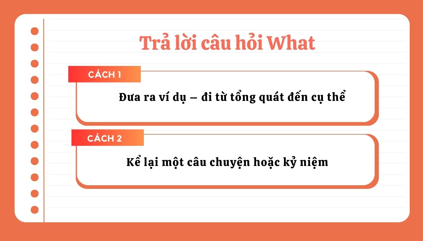 Câu hỏi What thường nhằm mục đích yêu cầu mô tả một sự vật, sự việc, hoạt động hay trải nghiệm. Để triển khai hướng trả lời Speaking Part 2 cho dạng câu hỏi này, bạn có thể lựa chọn 1 trong 2 cách sau: