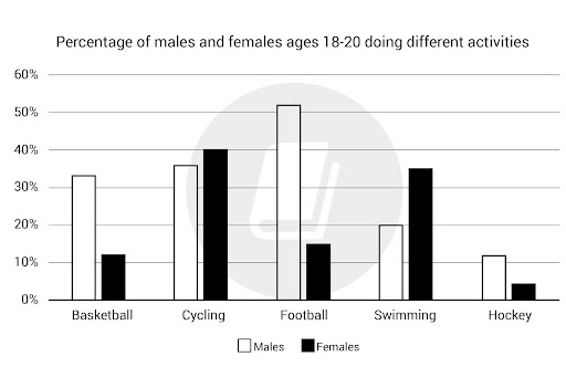 Trong bối cảnh giới trẻ ngày càng có nhiều lựa chọn giải trí và hoạt động trong thời gian rảnh, việc tìm hiểu xu hướng tham gia của họ mang lại nhiều thông tin thú vị. Biểu đồ cột được cung cấp minh họa tỷ lệ nam và nữ trong độ tuổi 18–20 tại một thành phố tham gia vào các hoạt động khác nhau trong một tháng năm 2015, qua đó phản ánh sự khác biệt về sở thích giữa hai giới.