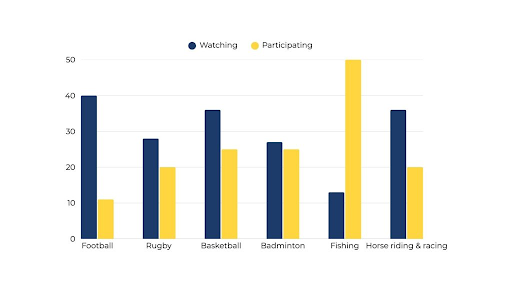 Xét hai thái cực, bóng đá ghi nhận tỷ lệ người xem cao nhất, đạt chính xác 40%, cao gần gấp bốn lần so với tỷ lệ tham gia (khoảng 11%), đây cũng là mức thấp nhất trong biểu đồ. Ngược lại, câu cá thể hiện xu hướng hoàn toàn trái ngược. Môn này có tỷ lệ người xem thấp nhất, chỉ 13%, nhưng lại có tỷ lệ tham gia cao nhất, đạt đỉnh 50%.