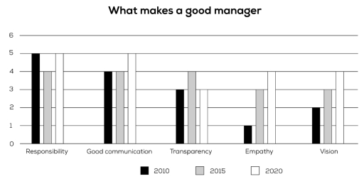 Nhìn chung, tinh thần trách nhiệm luôn được xem là đặc điểm quan trọng nhất của một người quản lý giỏi xuyên suốt giai đoạn này. Trong khi tầm quan trọng của khả năng giao tiếp tốt, sự thấu cảm và tầm nhìn tăng trưởng đều đặn, thì các mức đánh giá dành cho tinh thần trách nhiệm và tính minh bạch lại có những biến động nhẹ theo thời gian.