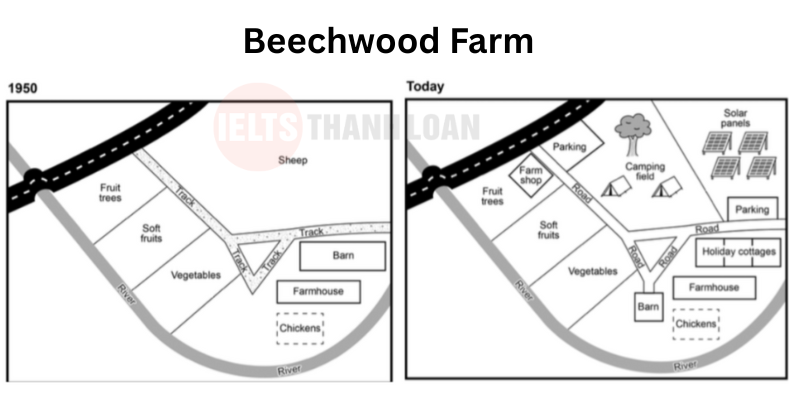 The plans below show the site of a farm in 1950 and the same site today. Summarise the information by selecting and reporting the main features, and make comparisons where relevant.